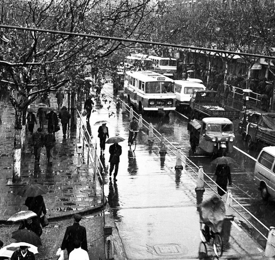 1981年的上海街景。圖中那輛三輪環(huán)衛(wèi)車輛,很可能是上海市工具修配廠1968年開始試制,20世紀70年代的主力環(huán)衛(wèi)垃圾清運車——工農(nóng)牌手把式三輪機動垃圾車(陸杰/攝)