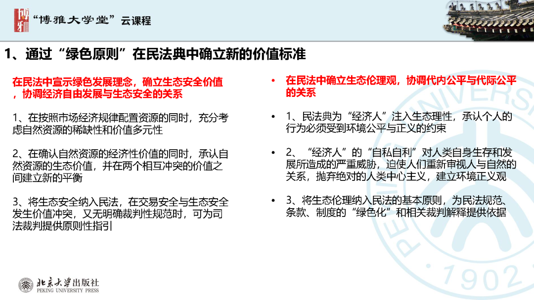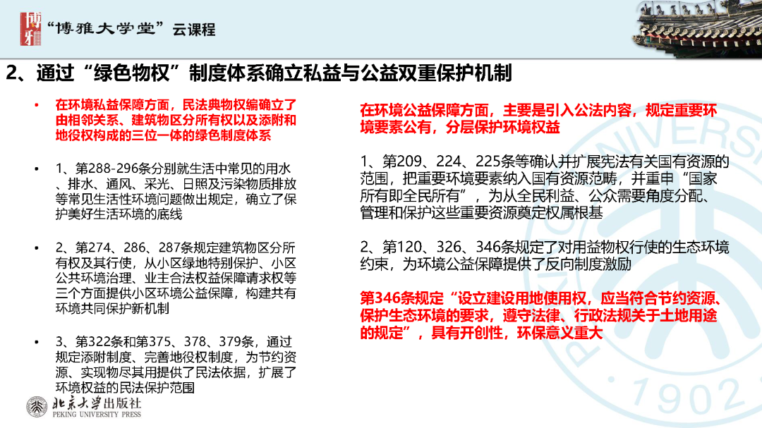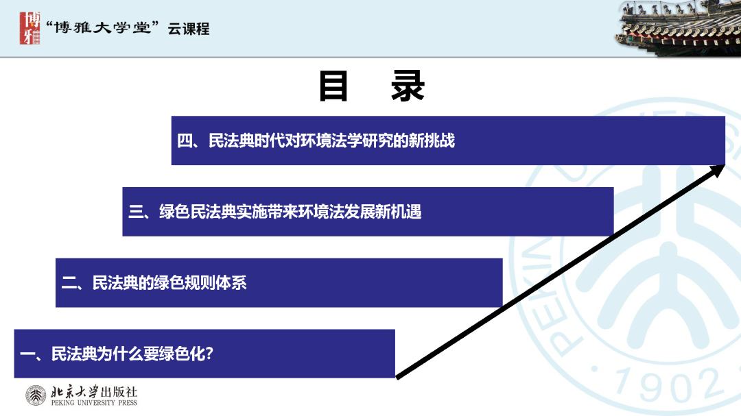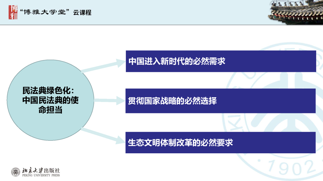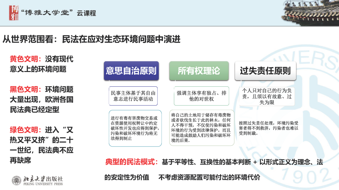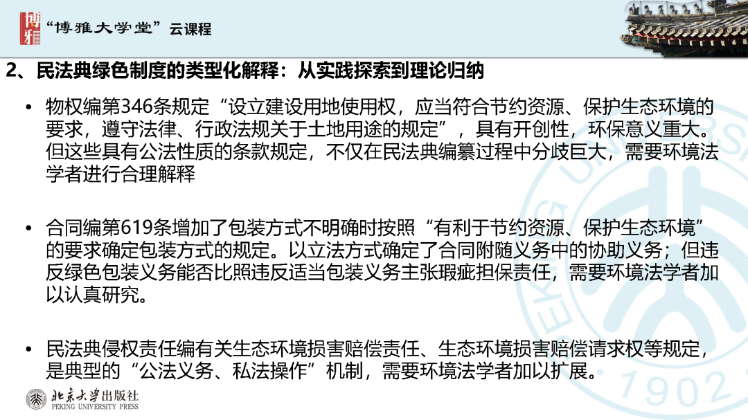 本文為?呂忠梅?老師在博雅大學堂上的報告。題目為《綠色民法典實施:環(huán)境法的機遇與挑戰(zhàn)》。內容主要涉及民法典為什么要綠色化、民法典的綠色規(guī)則體系及綠色民法典給環(huán)境法帶來的新機遇和新挑戰(zhàn)。