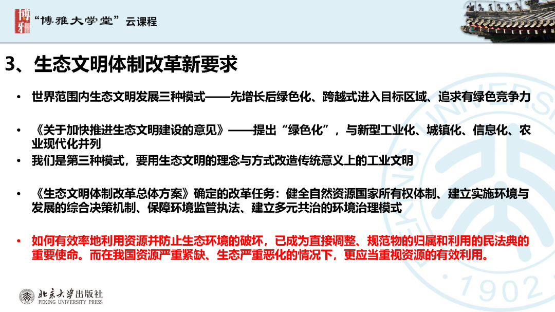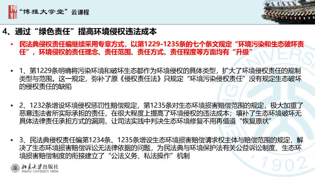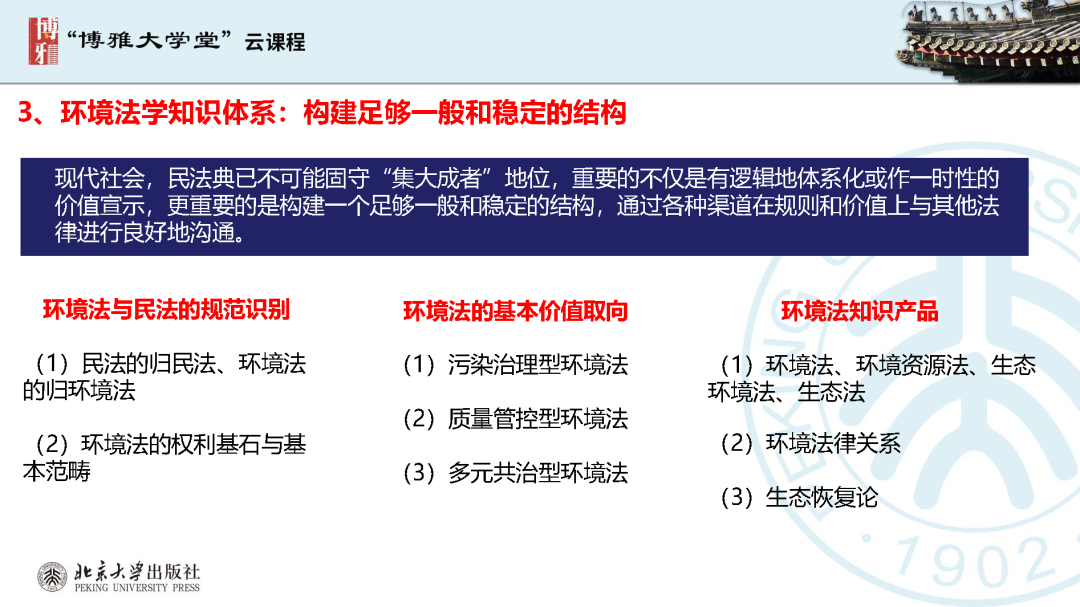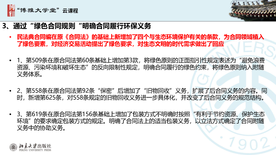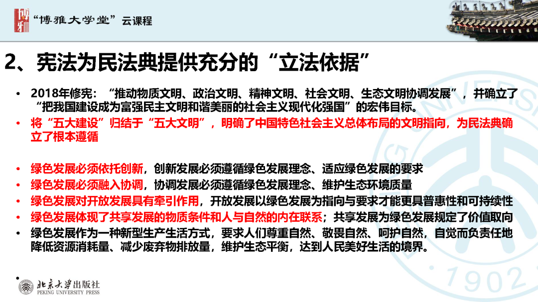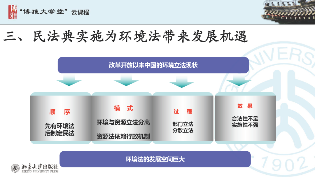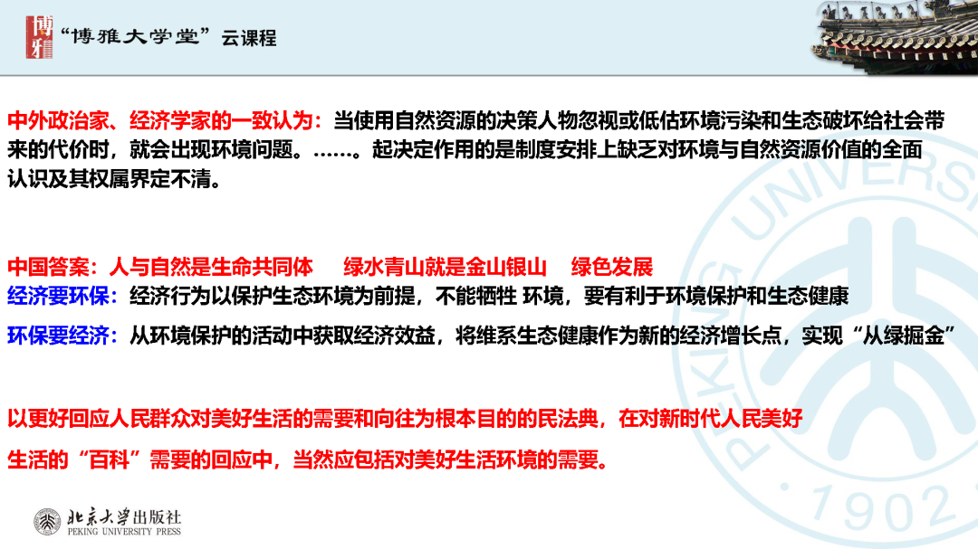 本文為?呂忠梅?老師在博雅大學堂上的報告。題目為《綠色民法典實施:環(huán)境法的機遇與挑戰(zhàn)》。內容主要涉及民法典為什么要綠色化、民法典的綠色規(guī)則體系及綠色民法典給環(huán)境法帶來的新機遇和新挑戰(zhàn)。