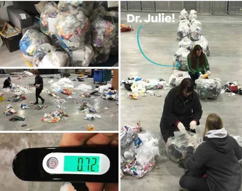 塑料垃圾分類記錄現(xiàn)場(chǎng),右圖中綠衣者為茱莉·施耐德博士