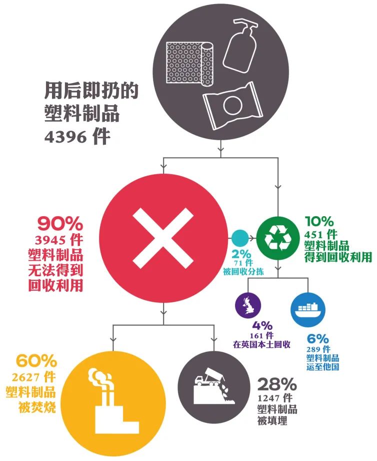 僅有4%的塑料垃圾會(huì)在英國(guó)當(dāng)?shù)剡M(jìn)行回收利用,而絕大多數(shù)垃圾因?yàn)闊o(wú)法回收,只能被焚燒或填埋處理。雖然塑料垃圾焚燒可以為居民提供供暖,但是也會(huì)帶來(lái)嚴(yán)重的環(huán)境二次污染問(wèn)題:塑料被焚燒后會(huì)釋放二氧化碳和有毒有害化學(xué)物質(zhì)。填埋也同樣會(huì)造成土壤和地下水污染等問(wèn)題。