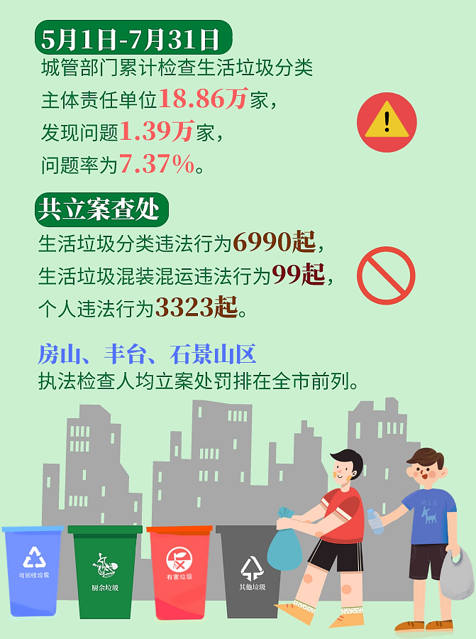 在此背景下,垃圾分類檢查執(zhí)法力度加強(qiáng)。5月1日至7月31日,執(zhí)法部門針對(duì)個(gè)人違法行為共查處3323起,查處個(gè)人違法行為的立案量占全部立案量的比例為58.20%。