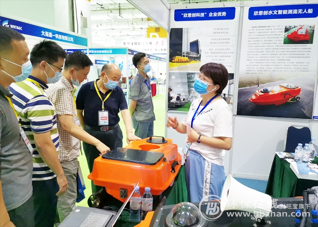 圖為展會期間,欣思創(chuàng)相關(guān)參展工作人員為專業(yè)人士介紹水文智能測流無人船
