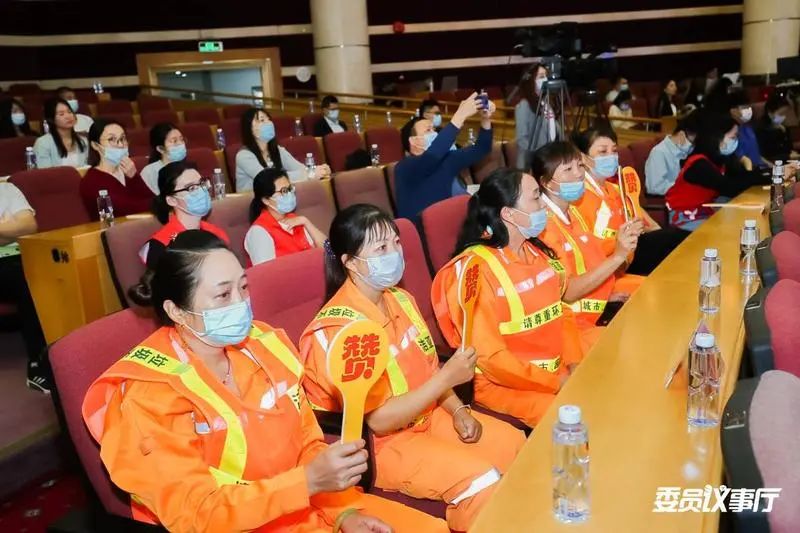 ▲5位環(huán)衛(wèi)工人也受邀來(lái)到了委員議事廳直播現(xiàn)場(chǎng)。