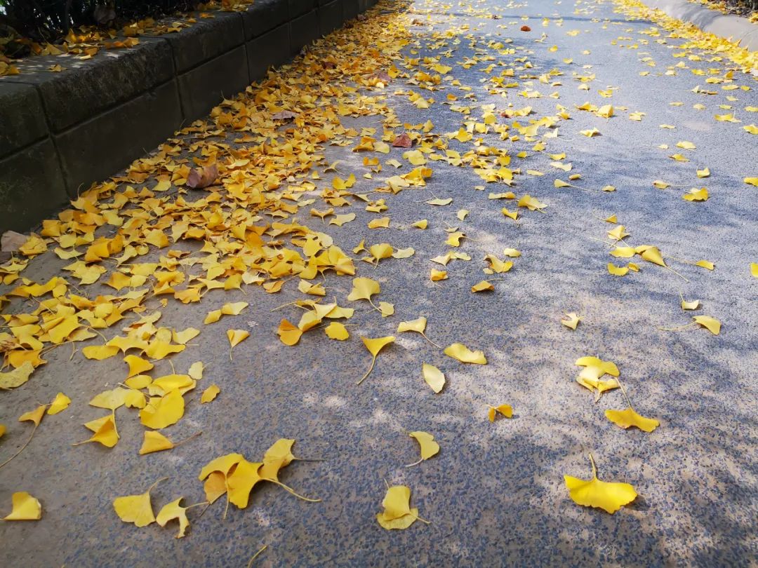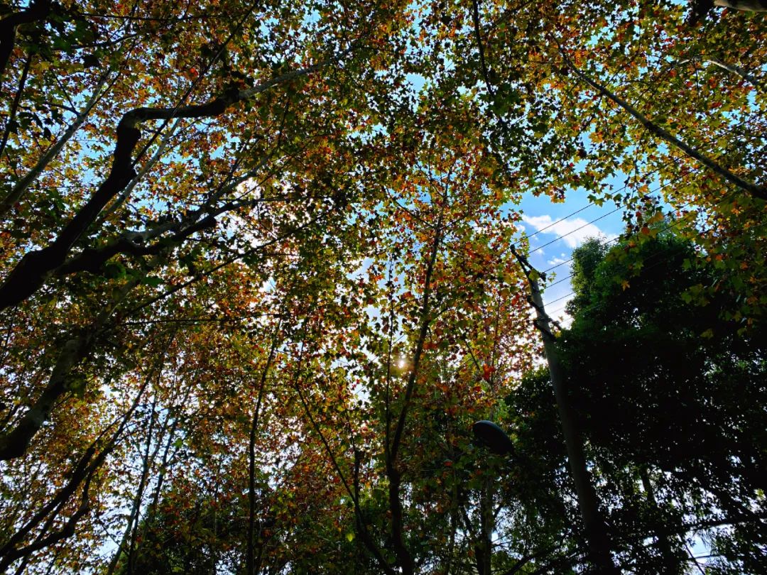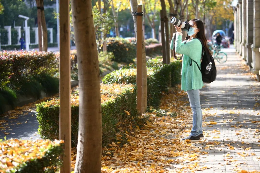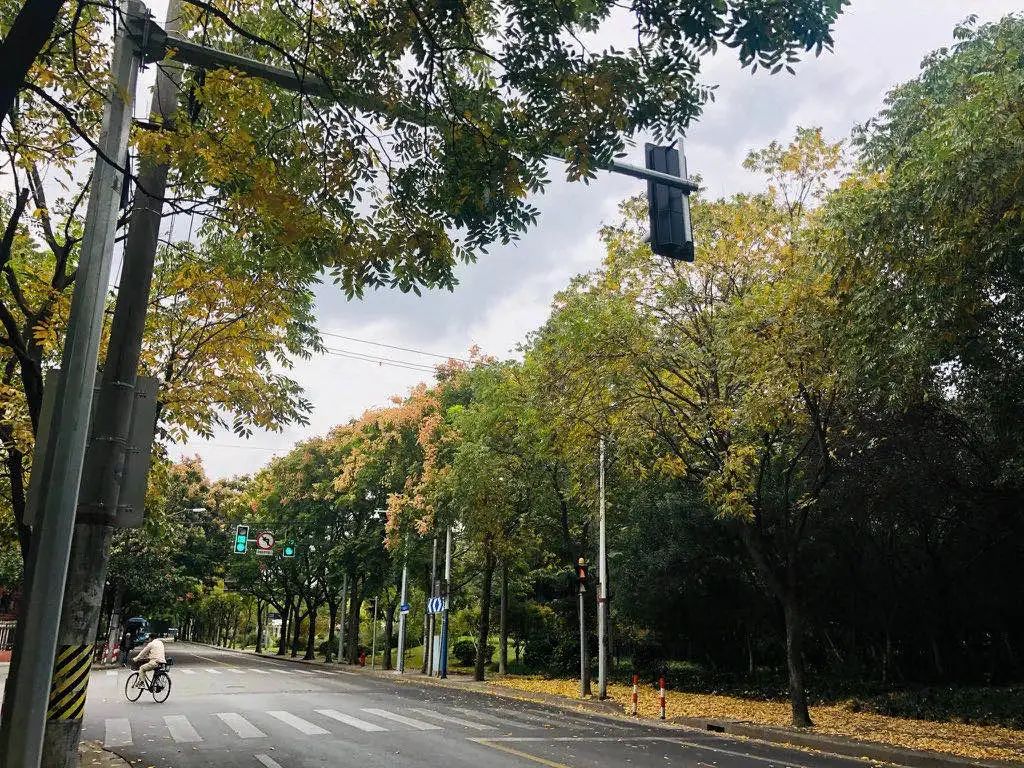 這條長(zhǎng)約1公里的道路兩旁種滿了無患子樹,葉片已經(jīng)由綠轉(zhuǎn)黃,只要有風(fēng)“經(jīng)過”,就能看到落葉轉(zhuǎn)著圈旋轉(zhuǎn)著掉落下來,金黃的葉片成為了上海街頭最美的裝飾。