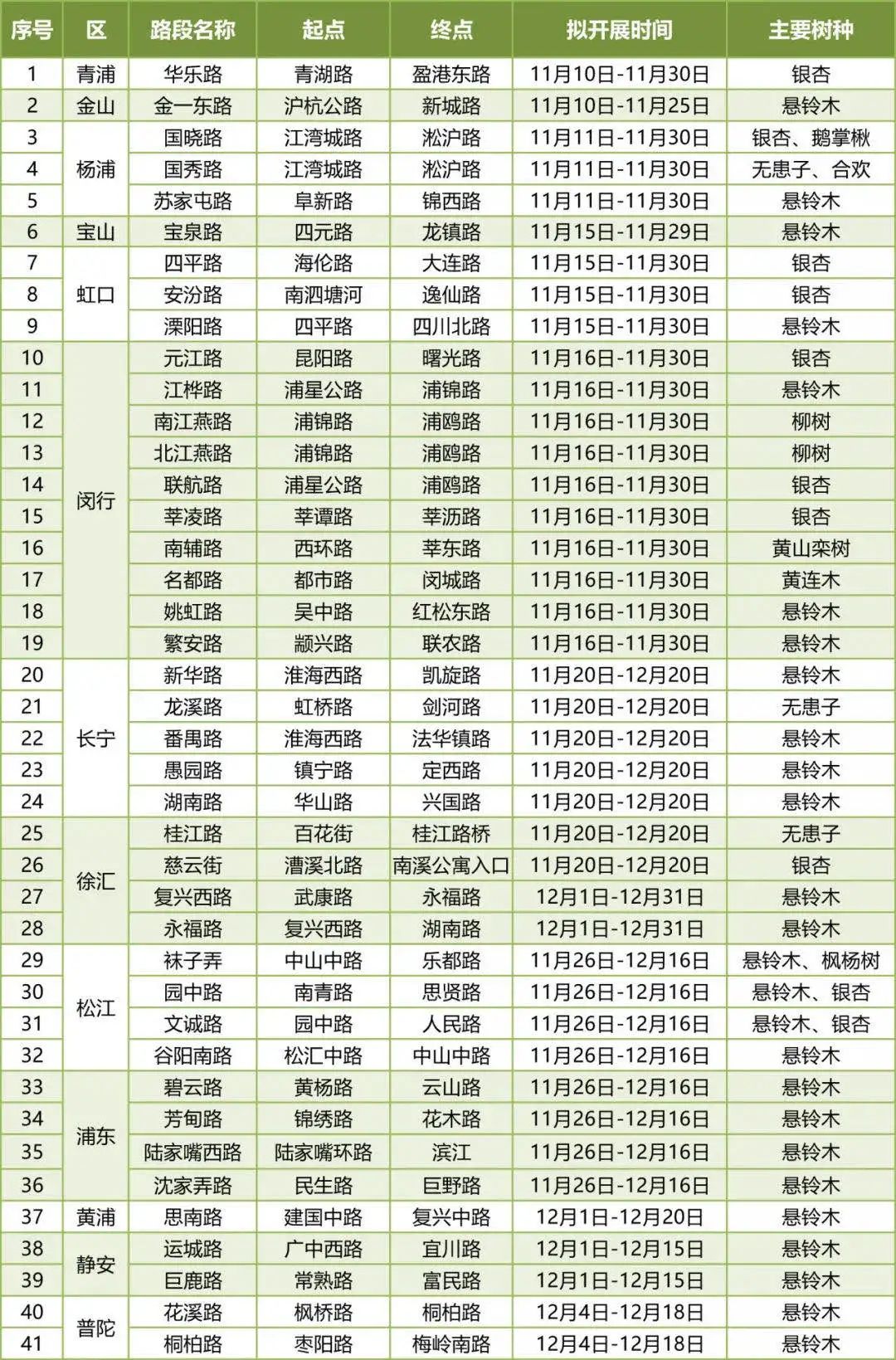 記者了解到,今年,上海各區(qū)在去年基礎(chǔ)上對(duì)景觀道進(jìn)行了梳理和評(píng)估,部分區(qū)對(duì)路段有所調(diào)整或替換。其中,閔行區(qū)新增了南江燕路和北江燕路,以柳樹為景觀樹種;名都路,以黃連木為景觀樹種;姚虹路和繁安路,均以懸鈴木為景觀樹種。徐匯區(qū)新增了慈云街,以銀杏為景觀樹種。楊浦區(qū)新增了蘇家屯路,以懸鈴木為景觀樹種。