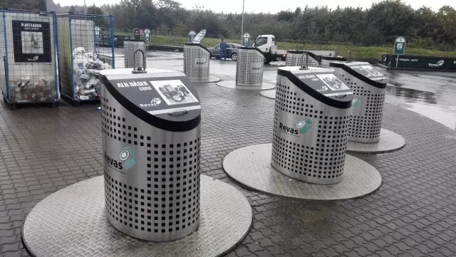 Revas的垃圾分類回收站有一個區(qū)域分布了幾個樣式別致的小垃圾桶,這些小垃圾桶是專供飲料罐和瓶子的,居民直接可通過這些垃圾桶把飲料罐和瓶子扔到地下的大集裝箱中,據(jù)Poul M?ller先生介紹,回收站地底下有100個集裝箱箱子用于飲料罐和瓶子的回收。