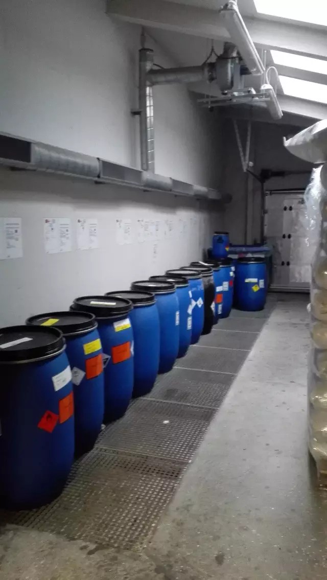 危廢這塊的收集比較嚴格,會被儲存在塑料桶中,然后集中放到一個小房間里面,這樣有效得隔絕了危廢和群眾的接觸。