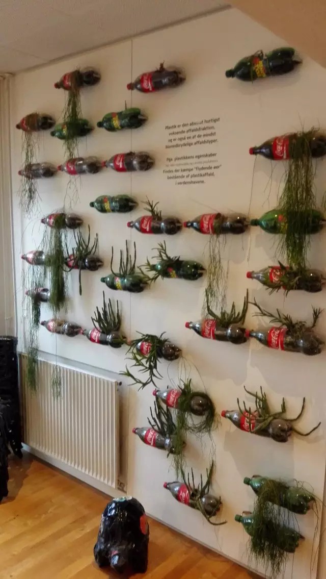 門口的墻上利用廢可樂瓶做的植物花盆,