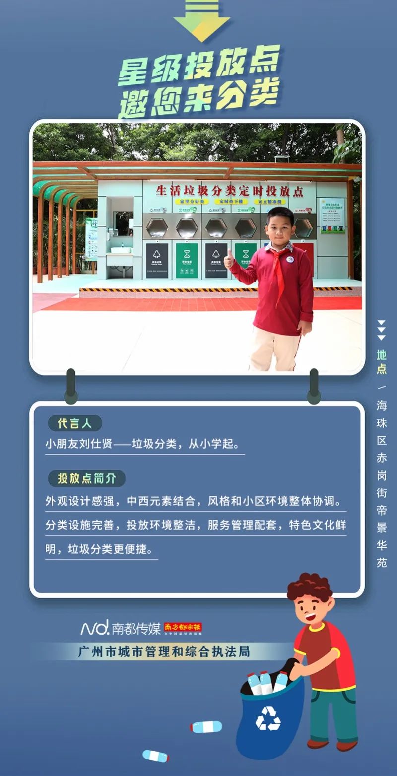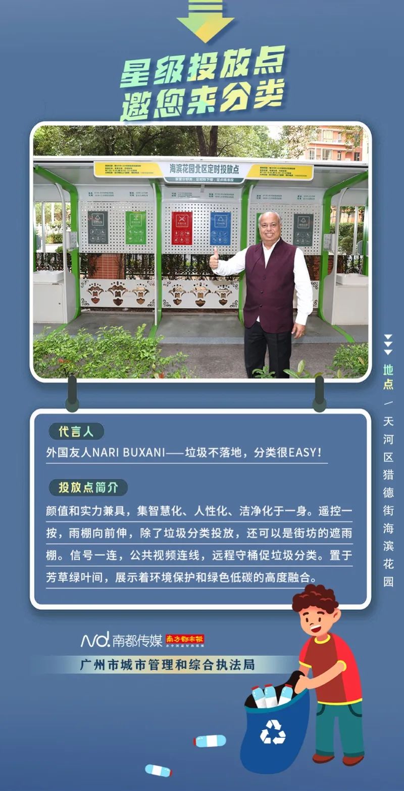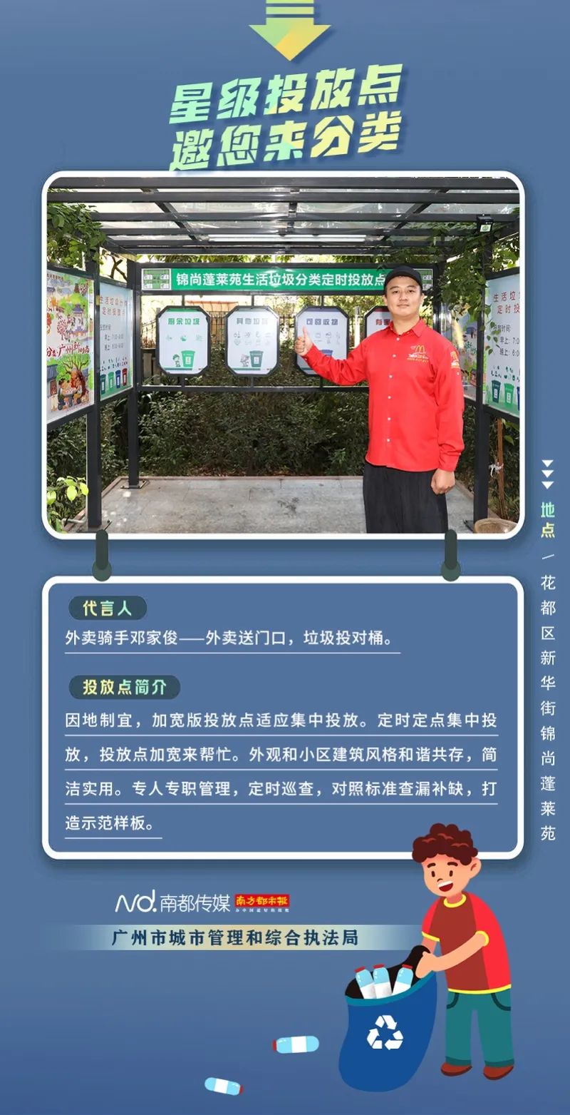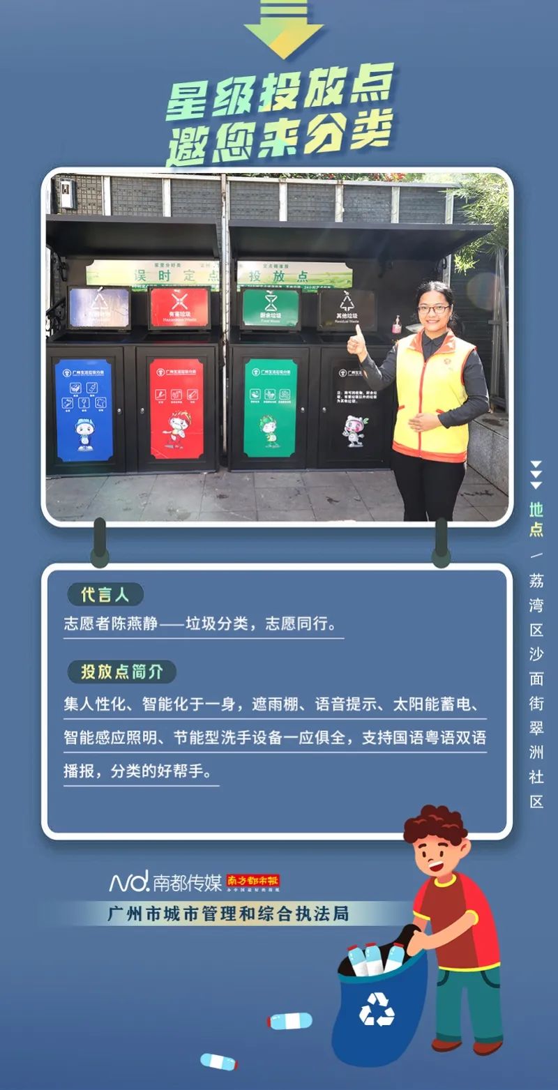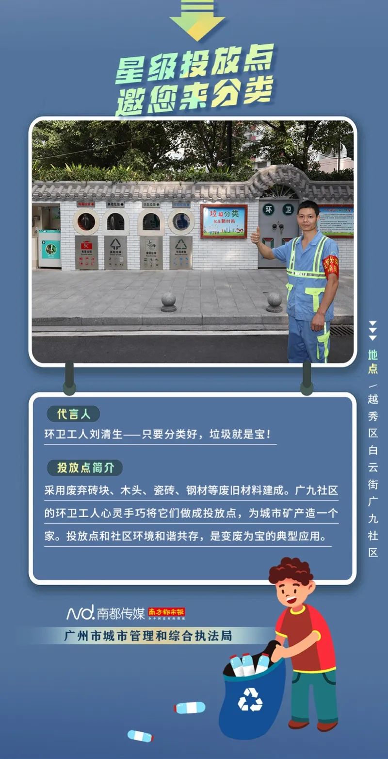 廣州市城市管理和綜合執(zhí)法局聯(lián)合南方都市報聯(lián)合推出“星級投放點(diǎn) 邀您來分類”系列海報,從廣州全市11個行政區(qū)遴選出“星級投放點(diǎn)”,并邀請來自各行各業(yè)的11位廣州街坊為廣州垃圾分類代言。