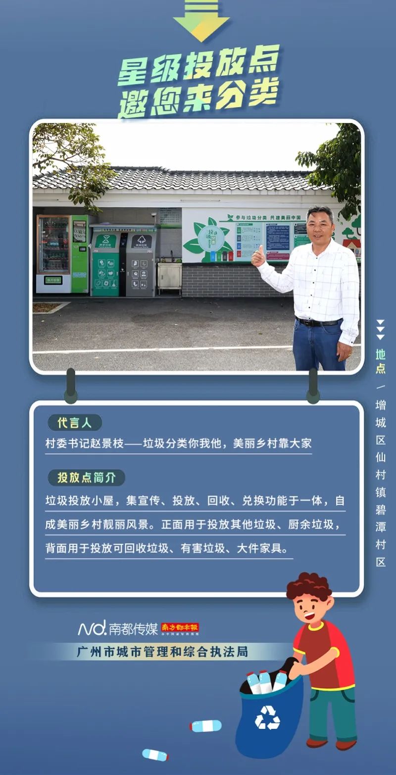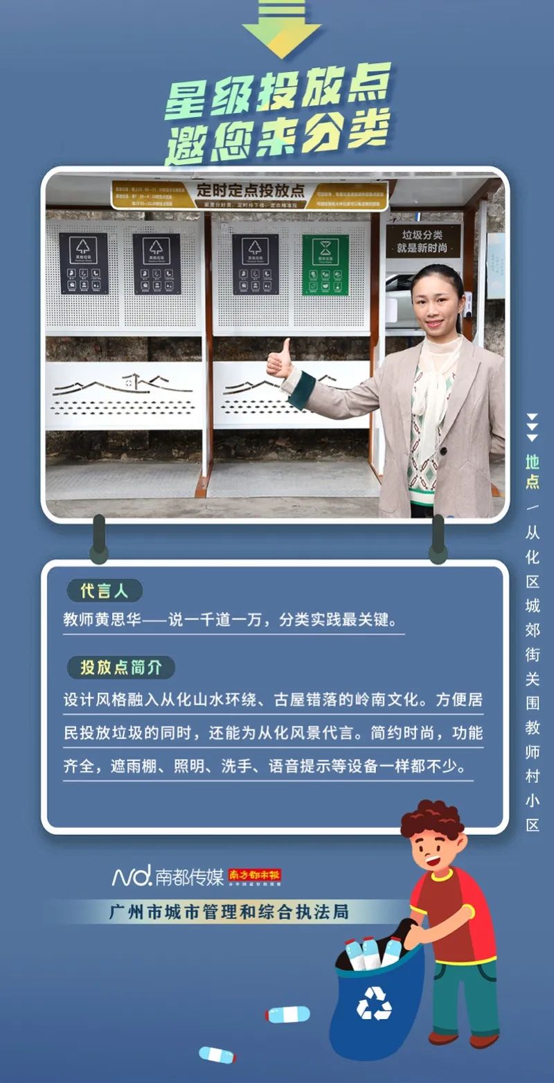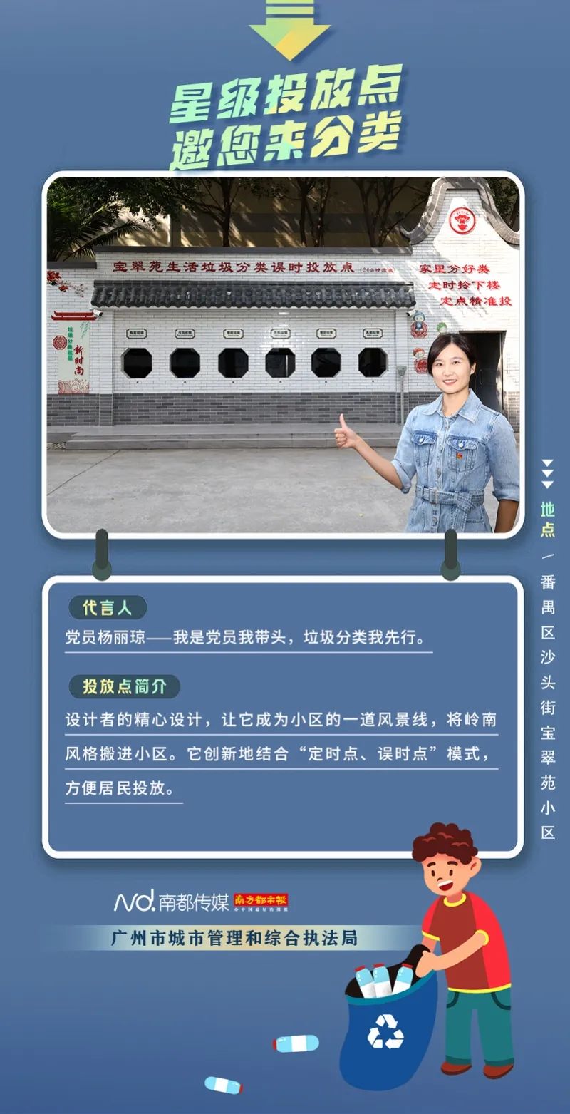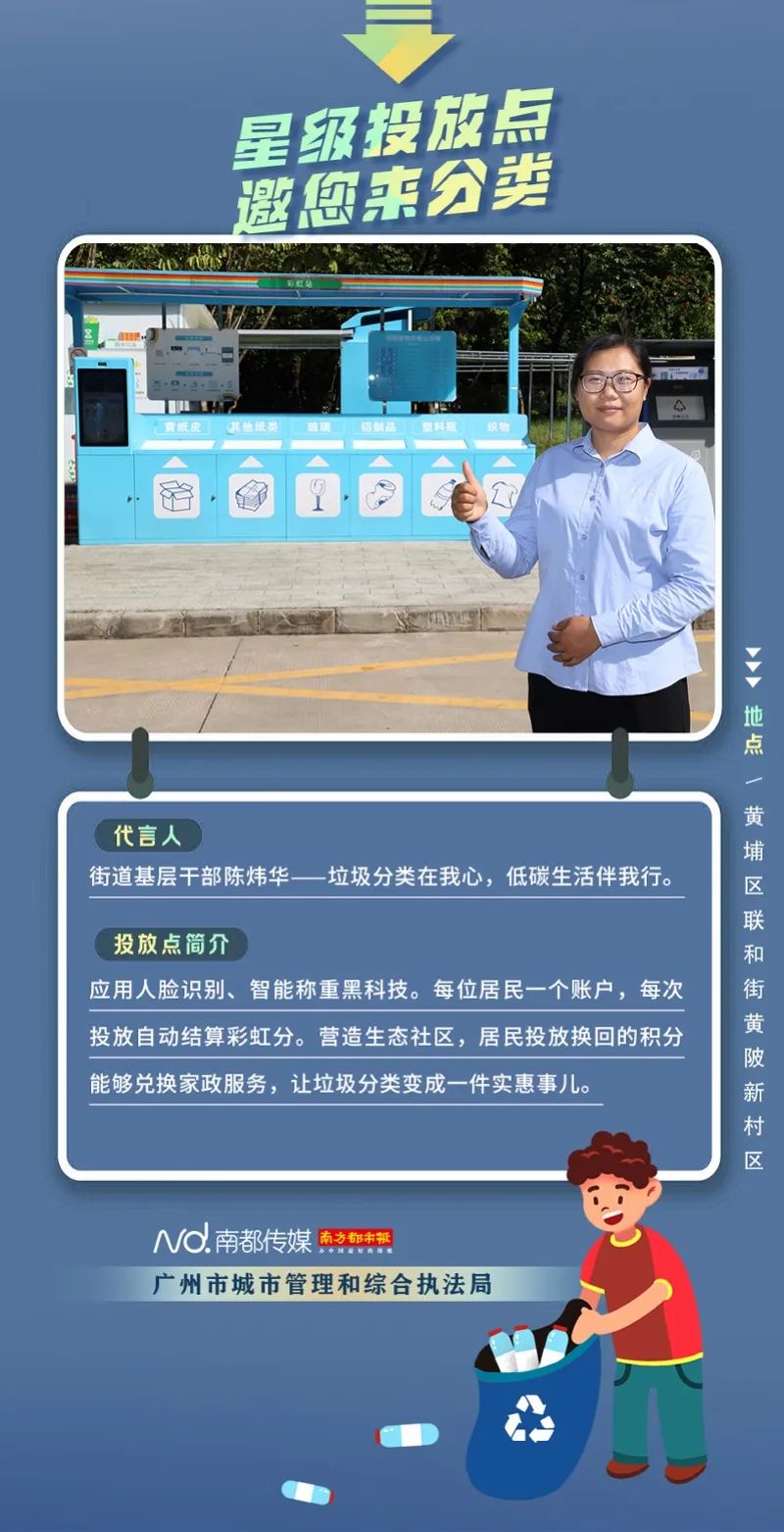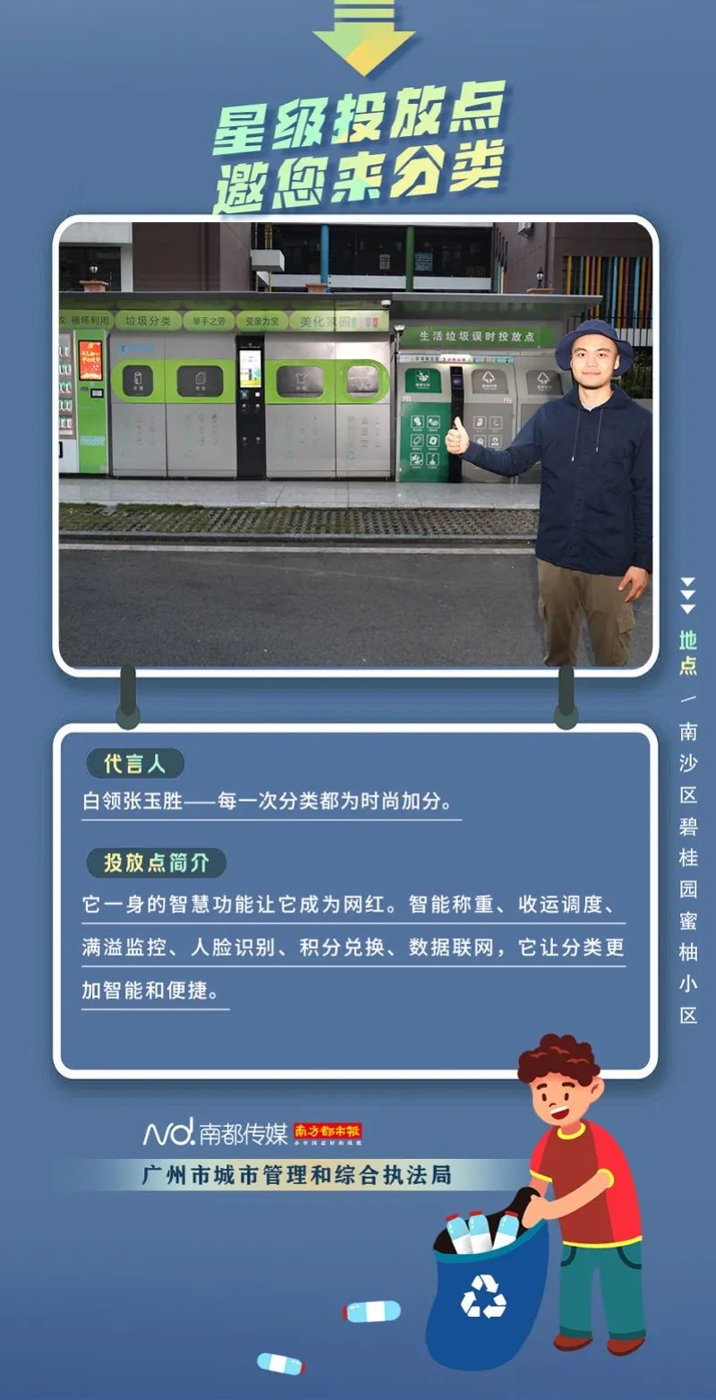 廣州市城市管理和綜合執(zhí)法局聯(lián)合南方都市報聯(lián)合推出“星級投放點(diǎn) 邀您來分類”系列海報,從廣州全市11個行政區(qū)遴選出“星級投放點(diǎn)”,并邀請來自各行各業(yè)的11位廣州街坊為廣州垃圾分類代言。