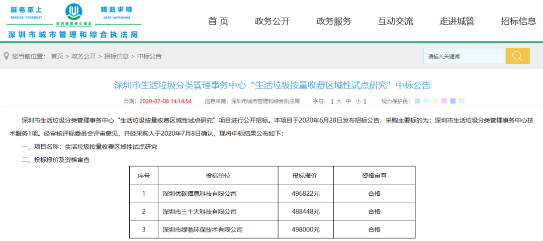 7月8日,深圳市生活垃圾分類(lèi)管理事務(wù)中心“生活垃圾按量收費(fèi)區(qū)域性試點(diǎn)研究項(xiàng)目”開(kāi)標(biāo),服務(wù)期限:2020年7月10日-2020年12月10日。