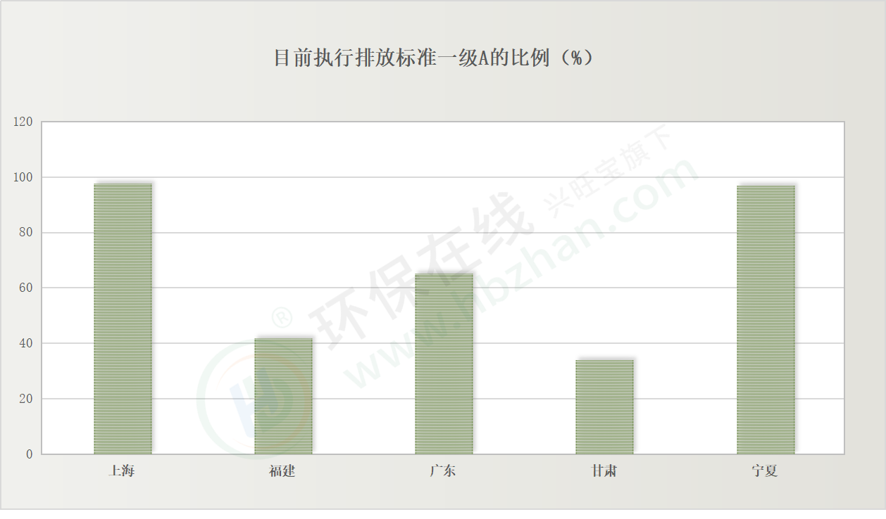 上海、福建、廣東、甘肅、寧夏被納入清單的污水集中處理設(shè)施目前執(zhí)行排放標(biāo)準(zhǔn)一級(jí)A的比例: