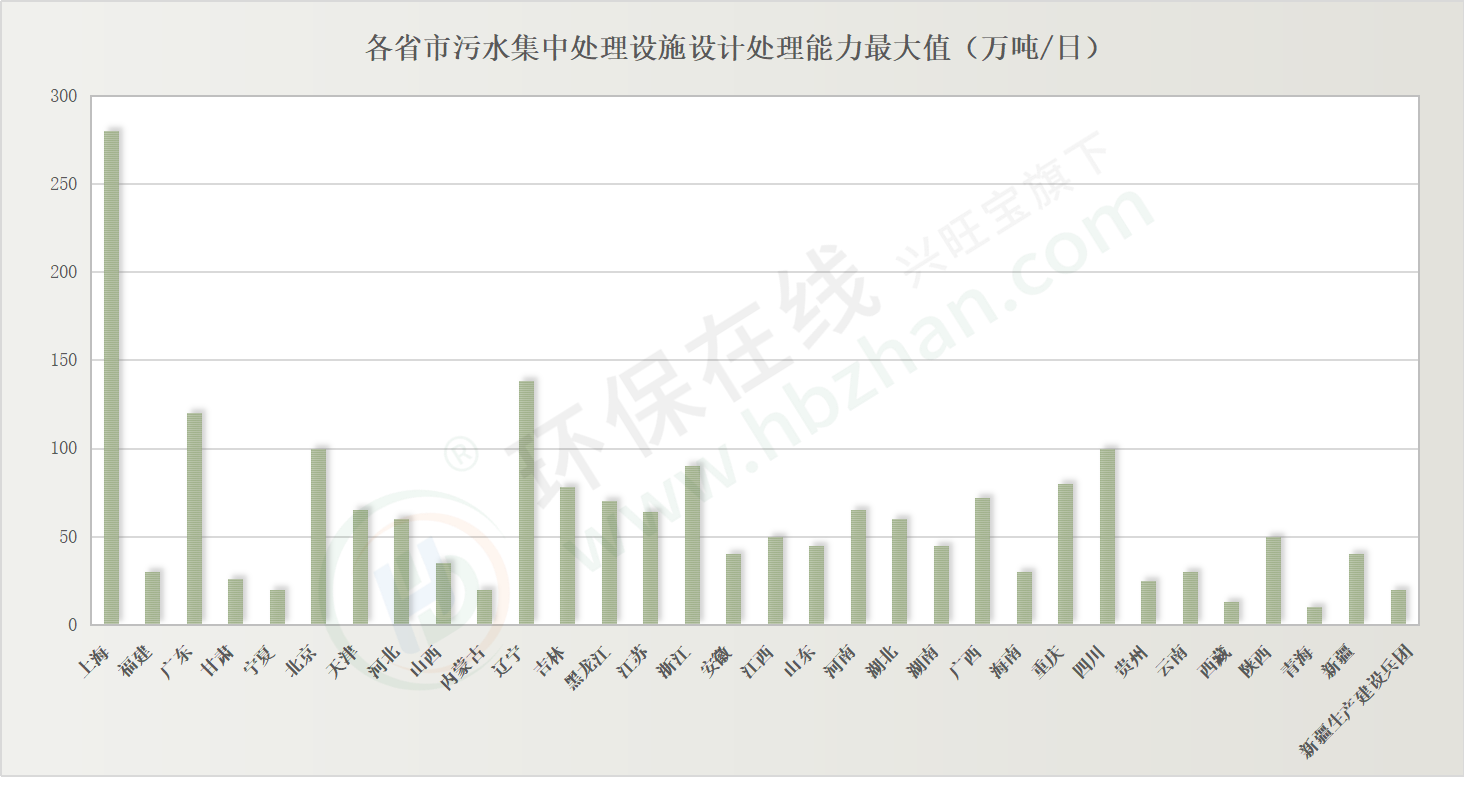 被納入清單的各省市污水集中處理設(shè)施設(shè)計(jì)處理能力最大值: