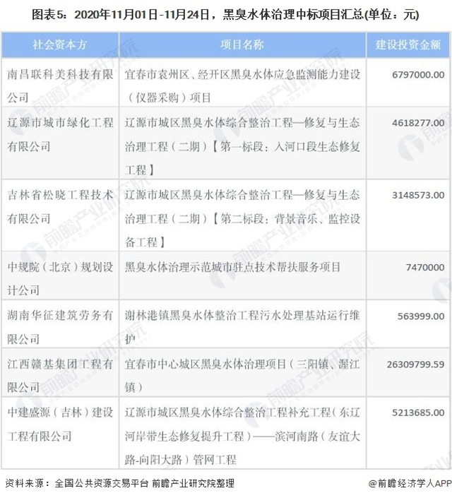 全國(guó)公共資源交易平臺(tái)數(shù)據(jù)顯示,2020年11月01日-11月24日,共15起社會(huì)資本中標(biāo)黑臭水體治理項(xiàng)目,投資額總計(jì)8939.69萬(wàn)元,其中,包含6個(gè)黑臭水體整治項(xiàng)目。