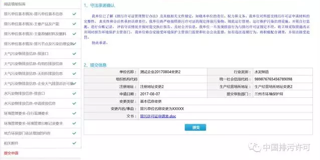 排污單位填寫完所有信息后,點(diǎn)擊“提交”按鈕,即完成排污許可證變更申報(bào)。系統(tǒng)會(huì)對變更內(nèi)容進(jìn)行標(biāo)識(shí),綠色文字為排污單位變更過程中新增內(nèi)容,紅色文字為排污單位變更過程中修改內(nèi)容。