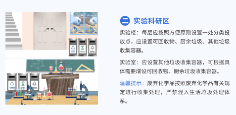 學(xué)校場(chǎng)景的指引按師生的日?;顒?dòng),分區(qū)進(jìn)行指導(dǎo),貼合師生生活實(shí)際。其中對(duì)實(shí)驗(yàn)科研區(qū)可能會(huì)產(chǎn)生廢棄化學(xué)品,指引中做出了相關(guān)溫馨提示,“廢棄化學(xué)品按照廢棄化學(xué)品有關(guān)規(guī)定進(jìn)行收集處理,嚴(yán)禁混入生活垃圾處理體系”。