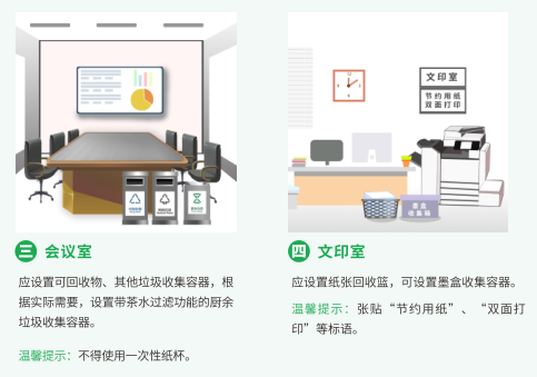 機(jī)關(guān)企事業(yè)單位、工業(yè)園區(qū)、商務(wù)寫字樓要發(fā)揮生活垃圾源頭減量示范作用,三份指引里明確提倡綠色辦公,優(yōu)先采購(gòu)可循環(huán)利用的產(chǎn)品,減少使用一次性辦公用品,推廣無(wú)紙化辦公,紙張盡量雙面書寫或雙面打印。另外會(huì)議室貼合實(shí)際設(shè)置帶茶水過(guò)濾功能的廚余垃圾收集容器,著重提示不得使用一次性紙杯。