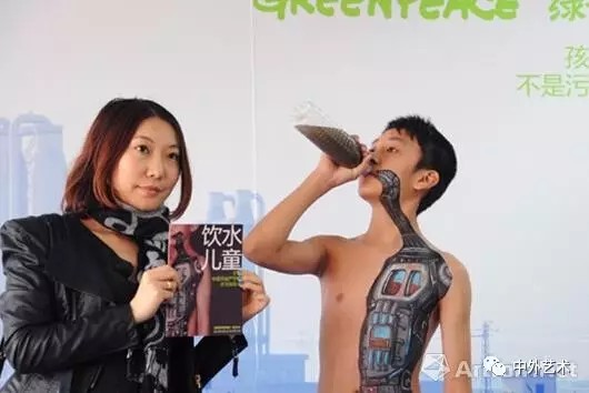 在上海第二屆廣告人藝術展上,由全球環(huán)保公益組織“綠色和平”等創(chuàng)意展示的行為藝術--“飲水兒童”讓現(xiàn)場觀眾頗具視覺的震撼,藝術家通過在模特兒童身上創(chuàng)意畫出宛如人體內臟的一個“水污染處理器”圖案,以此警示,污染飲用水對人類所造成的無法彌補的傷害,引發(fā)社會對水污染問題的關注和重視。
