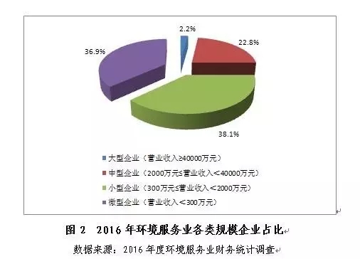 同時(shí),因環(huán)境服務(wù)業(yè)發(fā)展態(tài)勢向好且門檻較低而受到社會資本追捧,一些在傳統(tǒng)行業(yè)嚴(yán)重虧損或被迫退出的企業(yè)轉(zhuǎn)而進(jìn)入環(huán)境服務(wù)領(lǐng)域。從統(tǒng)計(jì)結(jié)果看,2016年,大型企業(yè)(以營業(yè)收入劃分)超過百家,但占比較上年下降0.2%,小微企業(yè)占比較上年小幅上升1%,達(dá)到75%。環(huán)境服務(wù)業(yè)仍以小微型規(guī)模經(jīng)濟(jì)單位為主體,行業(yè)分散的狀況未見明顯改善。