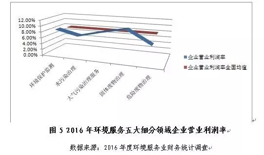 從盈利情況看,環(huán)境保護(hù)監(jiān)測、水污染治理、大氣污染治理、固體廢物治理和危險(xiǎn)廢物治理五大細(xì)分領(lǐng)域中,僅固體廢物治理和危險(xiǎn)廢物治理領(lǐng)域的2016年?duì)I業(yè)利潤率較2015年有所提高,固體廢物治理領(lǐng)域以10.4%的營業(yè)利潤率成為五領(lǐng)域中盈利能力最高的細(xì)分行業(yè),危險(xiǎn)廢物治理領(lǐng)域營業(yè)利潤率同比增幅最高,約94.2%;環(huán)境保護(hù)監(jiān)測、大氣污染治理和水污染治理三領(lǐng)域的2016年?duì)I業(yè)利潤率同比分別下滑18.9%、11.3%和9.0%。