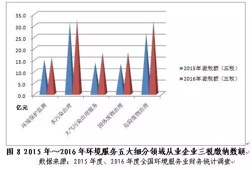 2016年企業(yè)繳納的營業(yè)稅金及附加、管理費(fèi)用中的稅金、應(yīng)交增值稅之和同比增長18.5%,達(dá)125.7億元。五大細(xì)分領(lǐng)域中,水污染治理、危險(xiǎn)廢物治理企業(yè)分別以32.5億元、31.9億元位居五大細(xì)分領(lǐng)域三稅繳納額的前兩位,分別貢獻(xiàn)了三稅總額的25.8%和25.4%。固體廢物治理企業(yè)2016年繳納三稅總額同比增速最大,達(dá)37.0%,這可能歸因于2016年我國城鎮(zhèn)化的深入推進(jìn),帶動了固體廢物處理領(lǐng)域市場空間的不斷擴(kuò)大,以及該領(lǐng)域明顯提高的營業(yè)利潤率。