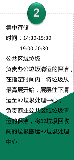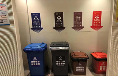 樓層公共區(qū)域的保潔工作人員負(fù)責(zé)垃圾初步分類(lèi),分類(lèi)垃圾桶內(nèi)的垃圾袋按顏色區(qū)分,在垃圾分好類(lèi)并用袋裝密封后,將由專(zhuān)人從上至下層層收集并運(yùn)輸,減少貨梯使用時(shí)間,提高垃圾運(yùn)輸效率。