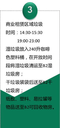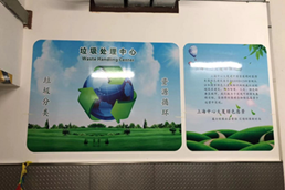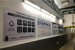 上海中心大廈對(duì)B2垃圾房(地下2層)進(jìn)行改造,改造后的垃圾房針對(duì)不同垃圾進(jìn)行分區(qū)管理,并添加了垃圾分類(lèi)相關(guān)的宣傳海報(bào)及公示欄。結(jié)合BOMA(中國(guó))標(biāo)準(zhǔn)將管理文件、警示標(biāo)志,以及清潔消毒藥劑MSDS張貼上墻,引導(dǎo)白領(lǐng)、租戶(hù)正確投放垃圾。