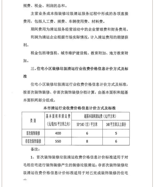 答1:早在1998年,上海市財政局曾發(fā)布過關(guān)于本市居民非生活垃圾行政事業(yè)型收費的標(biāo)準(zhǔn)。其中規(guī)定,裝修裝飾垃圾清運費最高不超過每套400元。此后,相關(guān)區(qū)清運單位將此作為參考標(biāo)準(zhǔn),曾實行過一室戶200元、兩室戶300元、三室戶400元的價格。2004年,財政部門將行政事業(yè)性收費改為市場指導(dǎo)價。