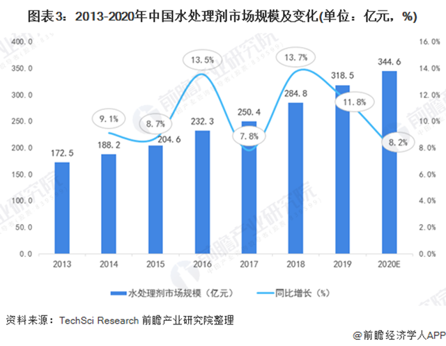 我國的水處理藥劑市場處于快速增長的階段,根據(jù)TechSci Research數(shù)據(jù)顯示,2019年我國水處理劑市場規(guī)模達(dá)318.5億元,預(yù)計(jì)2020年我國市場規(guī)模增長率約為8.2%,達(dá)到344.6億元。