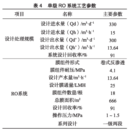 單級RO主要是針對兩級DTRO系統(tǒng)出水氨氮值超過限值而采取的保安措施,單級RO系統(tǒng)的主要工藝參數(shù),見表4。