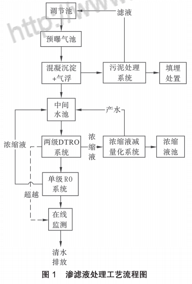 中間水池內(nèi)滲濾液由泵提升進(jìn)入兩級DTRO系統(tǒng)處理,兩級DTRO系統(tǒng)前設(shè)置了一套50um的 砂濾系統(tǒng)和一套10um的芯濾系統(tǒng),經(jīng)過兩級DTRO處理之后,產(chǎn)水經(jīng)過在線監(jiān)測系統(tǒng)達(dá)標(biāo)排放,兩級DTRO濃縮液進(jìn)入濃縮液減量化系統(tǒng)做減量處理, 濃縮液減量化系統(tǒng)的產(chǎn)水進(jìn)入中間水池,再次進(jìn)入兩級DTRO系統(tǒng)處理,濃縮液減量化系統(tǒng)的濃縮液排放到濃縮液池暫存。