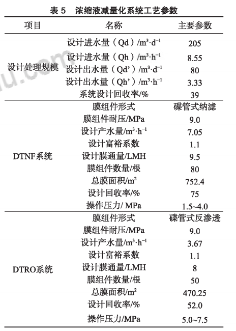 濃縮液減量化系統(tǒng)包含單級DTNF和單級DTRO,用于處理兩級DTRO系統(tǒng)產(chǎn)生的濃縮液, 將兩級DTRO濃縮液再次濃縮,該套系統(tǒng)內(nèi)的DTRO采用相對低截留率、高通量的RO膜。濃縮 液減量化系統(tǒng)設(shè)備的產(chǎn)水再進(jìn)入兩級DTRO設(shè)備中再次處理,能夠?qū)崿F(xiàn)濃縮液的減量,濃縮液減量 化系統(tǒng)的工藝參數(shù)見表5。