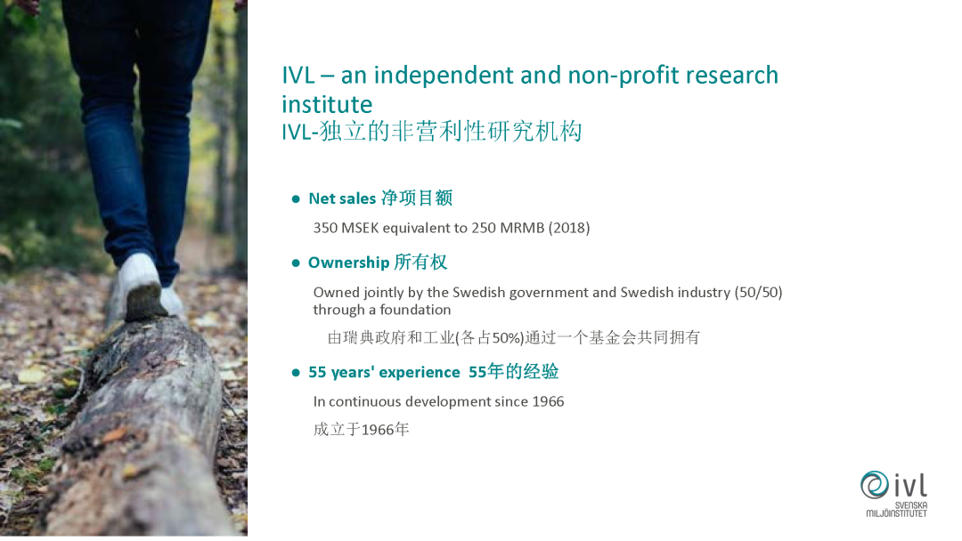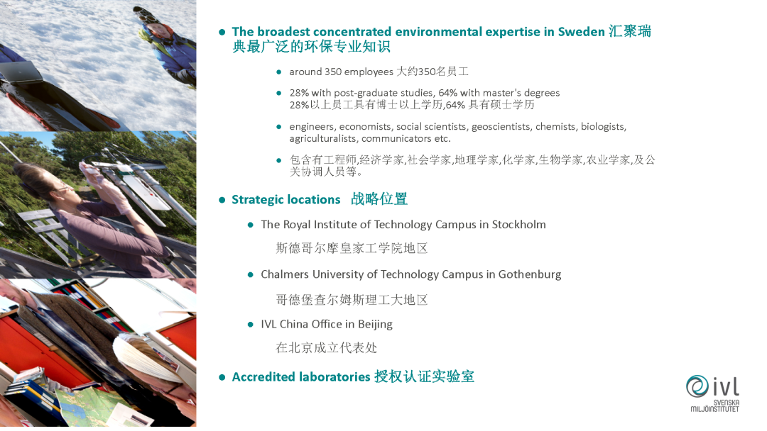先簡單介紹一下我們的機構(gòu),我們的機構(gòu)是由瑞典的政府和工業(yè)各占50%成立的一個非盈利性的應(yīng)用性的研究機構(gòu),成立于1966年,到目前有五十多年的歷史。我們的總部是在瑞典的首都斯德哥爾摩,在其他的國家,在中國和印度都有代表處,目前我們有350名的員工。包括環(huán)境工程師、經(jīng)濟學(xué)家、社會學(xué)家等等各方面一些跨學(xué)科的專家,在瑞典我們有自己的實驗室,除了科研以外也做一些技術(shù)開發(fā)、技術(shù)轉(zhuǎn)移等工作。