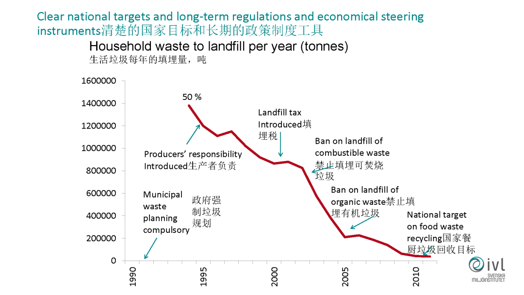 瑞典為什么能那么快實現(xiàn)垃圾填埋率的降低,在90年的時候它的垃圾填埋率也很高,后來出臺了一系列的政策。比如他規(guī)定各個地方政府必須強制有垃圾的管理和規(guī)劃,他也是在全球提出生產(chǎn)者責(zé)任延伸制度的一個國家,在這方面提升了很大的垃圾回收率,進(jìn)一步減少了垃圾的填埋率。后續(xù)提出了垃圾填埋稅,它的填埋稅是非常高的,一噸大概有一千塊錢左右的填埋稅。再往后提出了更加嚴(yán)苛的要求,比如對可以焚燒的垃圾,還有有機的垃圾,現(xiàn)在都是完全禁止去填埋的。再往后,對整個國家餐廚垃圾的回收制定了目標(biāo),比如我們在斯德哥爾摩在2020年必須達(dá)到50%的餐廚垃圾的回收利用,不能去填,也不能去燒。