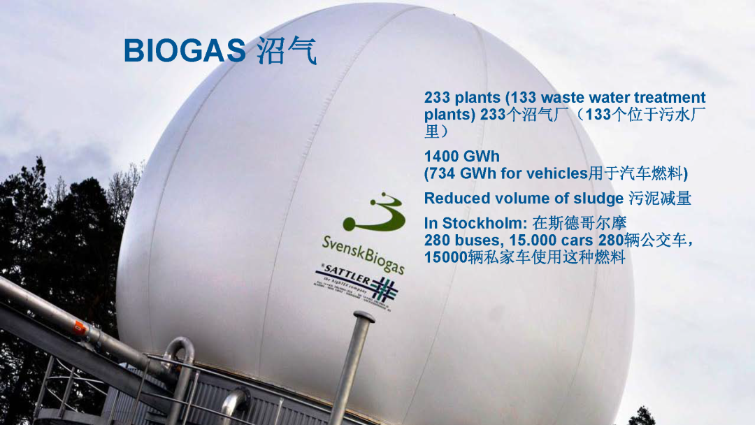 另外一個特色,瑞典的沼氣生產(chǎn)出來,不是像我們傳統(tǒng)中國所提的是農(nóng)業(yè)沼氣,它是工業(yè)化的,是完全經(jīng)過提純和壓縮,用到它的公交車?yán)锘蛘攮h(huán)衛(wèi)的車輛里,是這樣循環(huán)使用的。它的沼氣提純用在交通領(lǐng)域的應(yīng)用在全球也是最領(lǐng)先的,超過一半的沼氣都是用在汽車燃料里。比如左側(cè)的大公交車,隨處可見的大公交車,上面有一個小頂子,這里面裝的就是沼氣,壓縮和提純以后的沼氣。