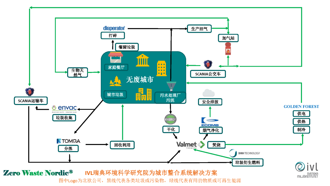 這是我們初步的聯(lián)盟的解決方案,目前我們所含的無廢城市的解決方案包括餐廳的餐廚垃圾,餐廚垃圾我們有一間公司可以做很智能化的破碎和收集,收集起來不是像過去國內(nèi)在提的有爭議的,進(jìn)入到下水道,我們彌補的經(jīng)過一個容器把它收集起來,把它做沼氣。沼氣提純以后,可以用到這家公司的公交車?yán)?,也是很知名的一家北歐的供應(yīng)商。提純以后,可以作為可再生的天然氣回到城市里進(jìn)行回收和使用。同時可以用在環(huán)衛(wèi)的垃圾運輸車?yán)?,開始常老師講到環(huán)衛(wèi)車怎么更加清潔,這也是一個比較好的做法。普通的生活垃圾,這里面有一家瑞典公司是做智能化收集的,是把垃圾像收污水一樣收垃圾,垃圾不是投到垃圾桶,而是直接掉到地下的管廊里,它有高速的風(fēng),可以快速的把它運輸?shù)嚼修D(zhuǎn)站,在地上看不到垃圾和垃圾桶。回收以后,這家公司可以做一個很智能化的分揀,它是全球很知名的一家做自動化分選的公司。可以把很有價值的東西回收回來,沒有價值的東西進(jìn)一步去做能源回收。能源回收這一塊,這里有一家芬蘭公司是做垃圾焚燒做得比較好的,叫韋美德(音),焚燒以后,它的煙氣做到凈化,有一家公司是做煙氣凈化的。焚燒所產(chǎn)生的熱量由這家公司去設(shè)計,給城市供熱供冷、供電。還有一家芬蘭公司做垃圾衍生原料,垃圾處理以后,讓垃圾焚燒會更加便利。
