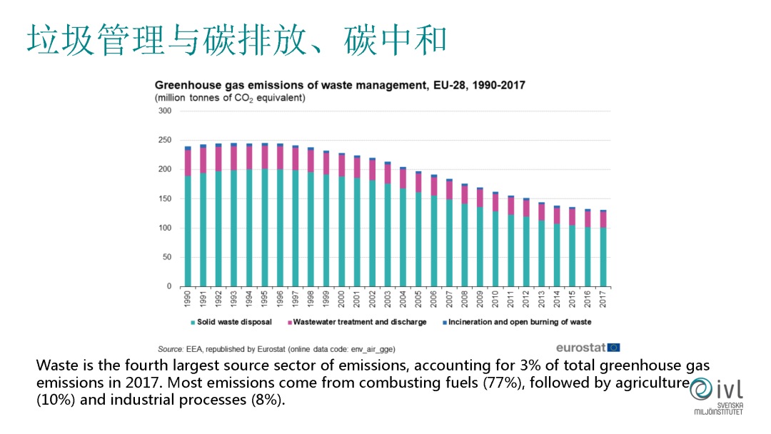 回到垃圾管理和碳排放、碳中和這個主題,我這邊做了一些調(diào)研,這是歐盟的一個數(shù)據(jù),它統(tǒng)計了在廢物處理行業(yè)內(nèi)它的溫室氣體排放。根據(jù)這個統(tǒng)計,我們發(fā)現(xiàn)我們廢物處理這個行業(yè)是整個社會第四大的溫室氣體排放,雖然它的比例不高,只有3%,但是它的排名是比較靠前的。別看我們這個行業(yè)不是很大,但是我們對碳排放和碳中和的貢獻(xiàn)也是不可小看的。