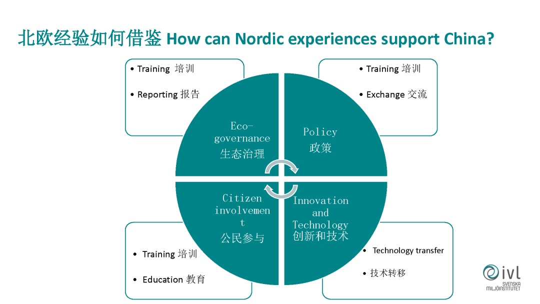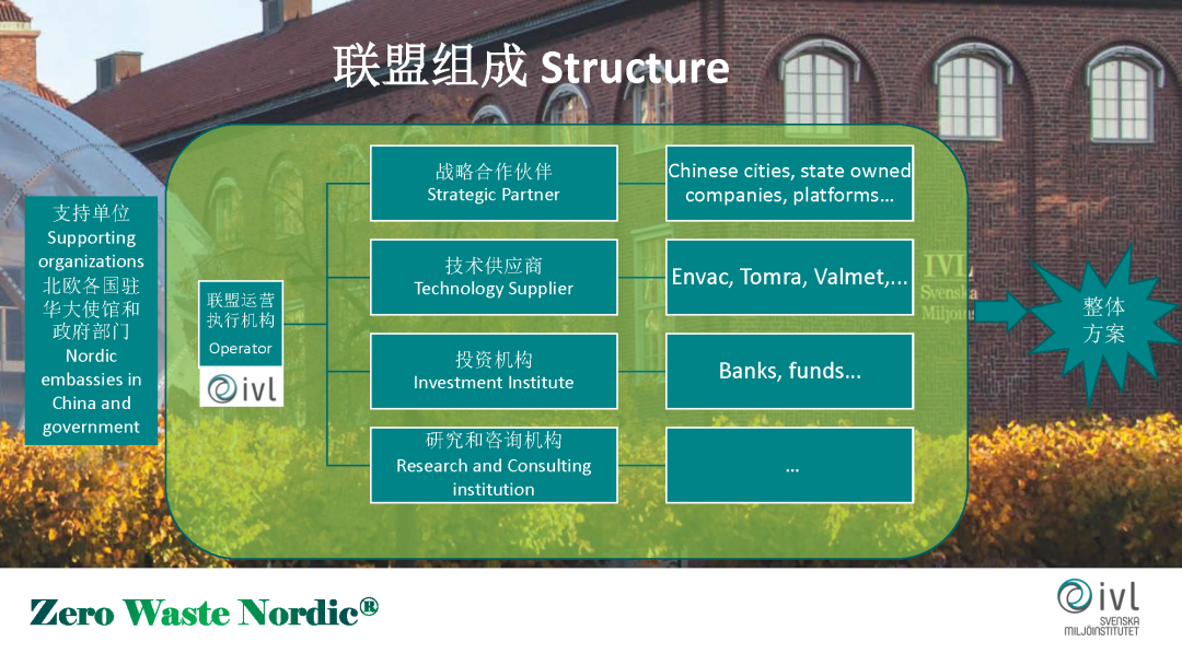 第一個就是在生態(tài)管理,生態(tài)治理方面,第二個就是通過政策的借鑒,第三個就是公民老百姓的參與,第四個就是創(chuàng)新和技術(shù)。在技術(shù)方面我們現(xiàn)在有這樣一些探索。我們成立了北歐無廢城市技術(shù)和投資聯(lián)盟這樣一個機構(gòu),這個機構(gòu)是由我們?nèi)鸬洵h(huán)科院成立的和運營的。我們邀請四位合作伙伴加入到我們這個聯(lián)盟,形成一個類似于航空母艦的整體解決方案,想為中國市場做一些服務(wù)。