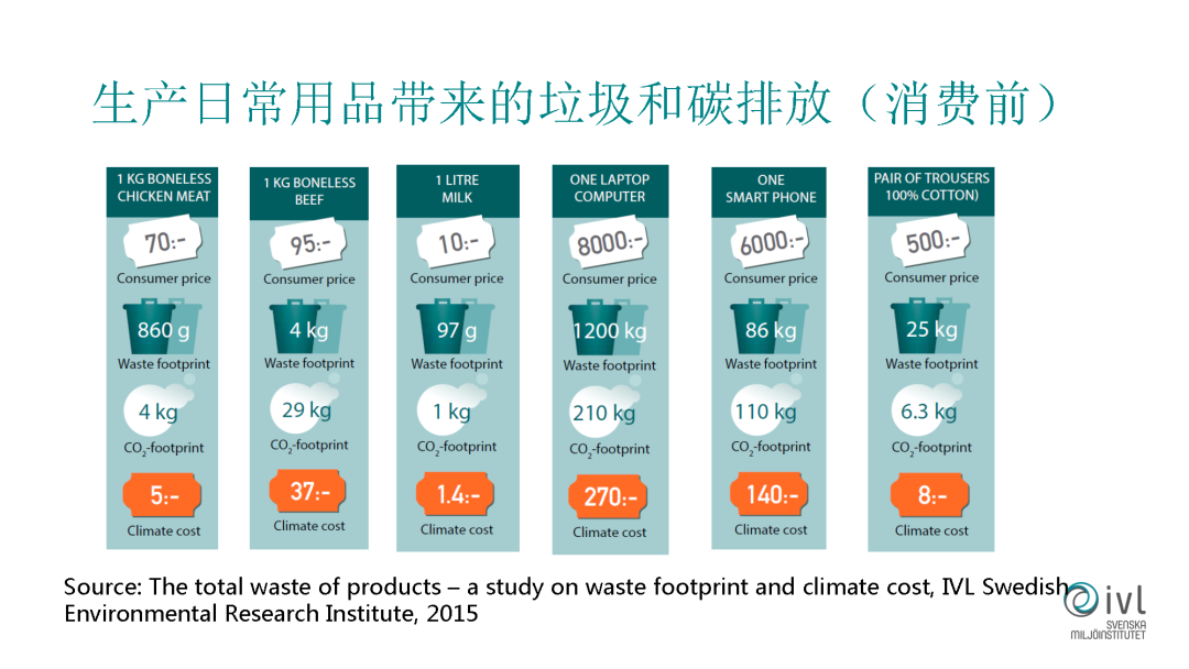 這個圖片想跟大家分享我們的一個研究報告,這是我們之前對我們?nèi)粘I钪兴褂玫囊恍┊a(chǎn)品的垃圾排放和碳排放的一些研究,我們選擇了一些代表性的日常消費品。比如我們吃的肉還有牛奶、電腦、手機等等,我們舉一個例子來說,比如說我們在買一部手機之前,它所產(chǎn)生的垃圾,在它生產(chǎn)和加工之前的垃圾就已經(jīng)有86公斤。這個量是非常大,它所帶來的碳排放已經(jīng)是110公斤,這也是非常大的。
