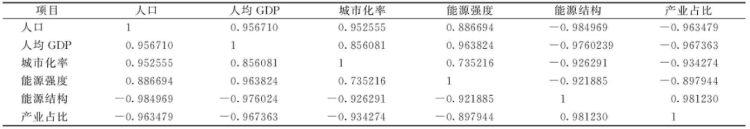 原始指標(biāo)的Pearson相關(guān)系數(shù)矩陣如表4所示??梢钥闯觯蟛糠种笜?biāo)之間存在高度相關(guān)性。其中,人均GDP和人口數(shù)的相關(guān)系數(shù)高達(dá)0.96,城市化率與能源強(qiáng)度和人口之間的相關(guān)系數(shù)絕對值也超過0.86。由于各個變量之間的相關(guān)性較強(qiáng),可以使用主成分分析提取主成分。