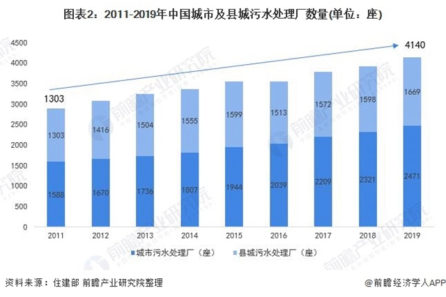 截止2019年底,我國城市污水處理廠達(dá)到4140座,城市污水處理廠和縣城污水處理廠分別為2471座和1669座。