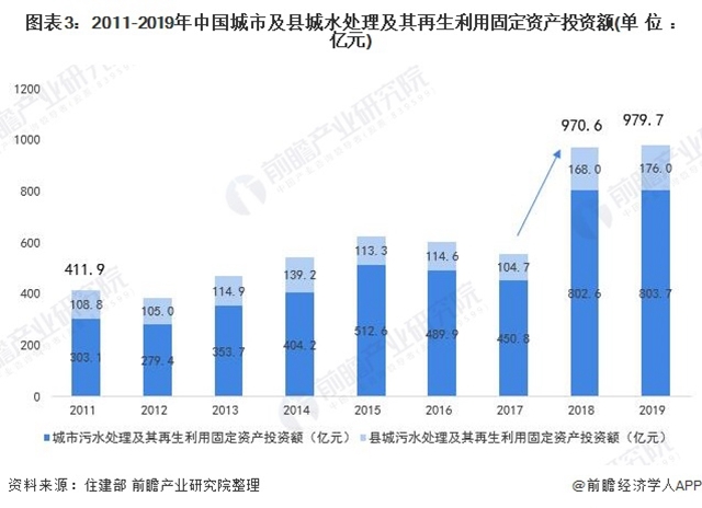 在投資額方面,2011-2017年,我國城市及縣城污水處理及其再生利用固定資產(chǎn)投資額維持在350-650億元區(qū)間范圍內(nèi)。2018年,我國城市及縣城污水處理及其再生利用固定資產(chǎn)投資額大幅增長,達(dá)到970.6億元,2019年投資額再創(chuàng)新高,達(dá)到979.7億元。