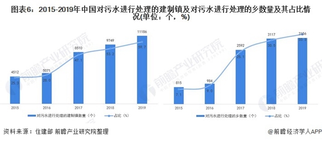 據(jù)住建部發(fā)布的《城鄉(xiāng)建設(shè)統(tǒng)計年鑒》統(tǒng)計數(shù)據(jù)顯示,2015年以來,我國農(nóng)村地區(qū)對污水進(jìn)行處理的建制鎮(zhèn)及鄉(xiāng)數(shù)量不斷增加。截止2019年底,對污水進(jìn)行處理的建制鎮(zhèn)及鄉(xiāng)的數(shù)量分別為11186個和3156個。