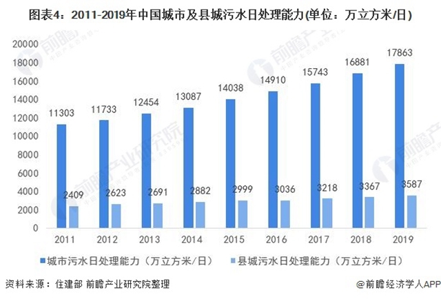 得益于污水處理設(shè)施的建設(shè),城市及縣城污水處理能力穩(wěn)步提升。城市污水日處理能力由2011年的11303萬立方米/日上升至2019年的17863萬立方米/日;縣城污水日處理能力也由2011年的2409萬立方米/日上升至2019年的3587萬立方米/日。