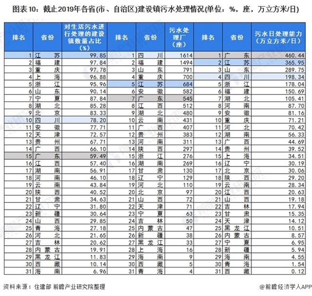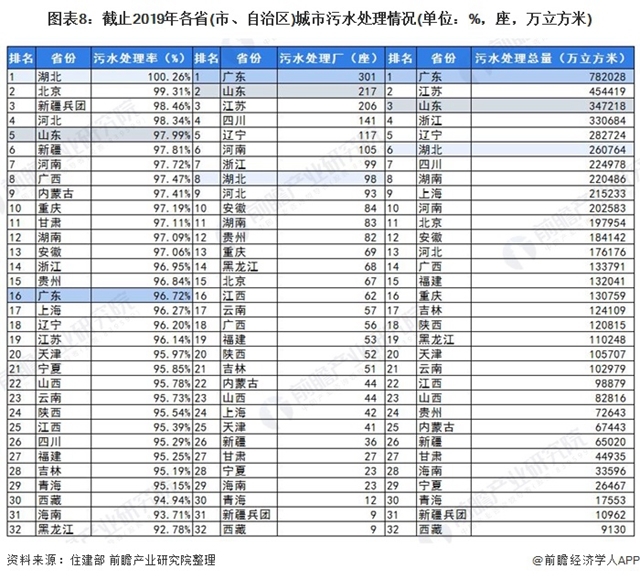 注:污水處理率為前瞻根據(jù)住建部公布的各省(市、自治區(qū))城市污水排放量及污水處理量數(shù)據(jù)進(jìn)行的測算,污水處理率=各省(市、自治區(qū))城市污水處理量/污水排放量。
