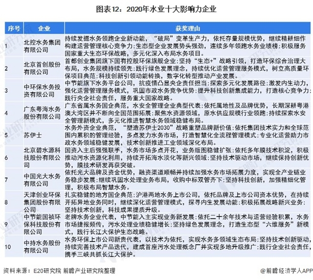 注:E20研究院根據(jù)企業(yè)的業(yè)績以及他們在資本市場、穩(wěn)健運(yùn)營、企業(yè)社責(zé)任等方面的綜合評價出2020水業(yè)十大影響力企業(yè)。