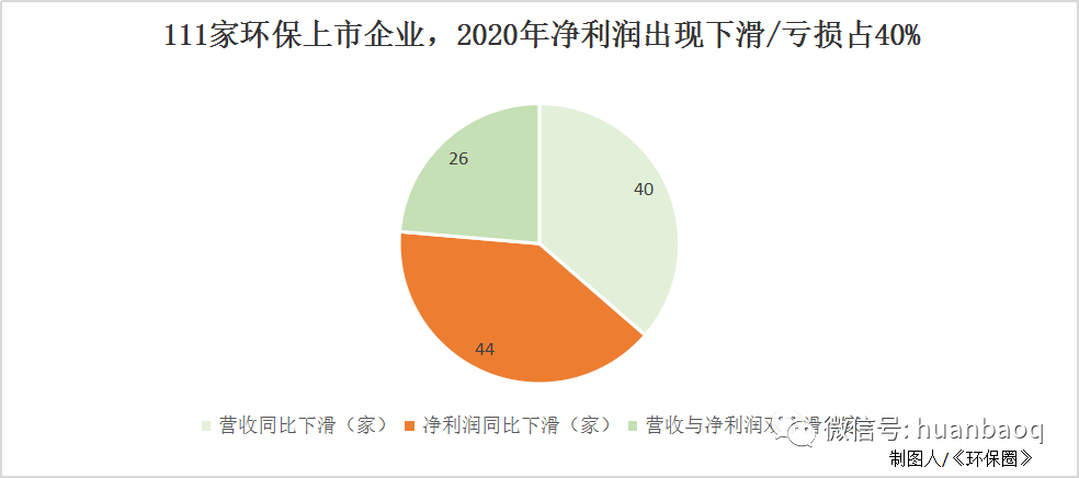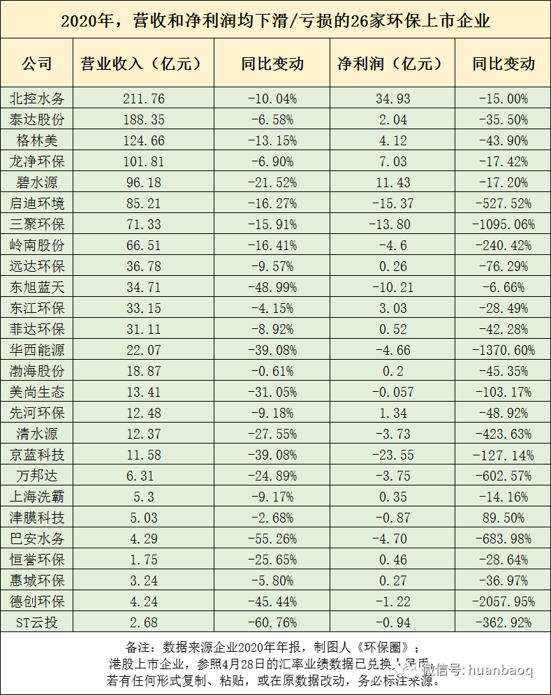 早在3月初,《環(huán)保圈》就已經(jīng)對(duì)55家環(huán)保上市企業(yè)的2020年業(yè)績(jī)預(yù)告進(jìn)行了統(tǒng)計(jì)分析,結(jié)果發(fā)現(xiàn),55家企業(yè)中,有6成企業(yè)2020年歸母凈利潤實(shí)現(xiàn)正增長,4成企業(yè)表現(xiàn)不理想,歸母凈利潤負(fù)增長,甚至虧損。如果將55家環(huán)保上市企業(yè)范圍擴(kuò)大2倍,增加到111家,總體情況是否會(huì)發(fā)生變化呢?據(jù)《環(huán)保圈》繼續(xù)跟蹤統(tǒng)計(jì),截止到5月6日,A股/港股已有111家環(huán)保上市企業(yè)如期完成了2020年年報(bào)的披露工作(業(yè)績(jī)?nèi)珗D附文末),這些上市企業(yè)業(yè)務(wù)涉及環(huán)境監(jiān)測(cè)、生態(tài)修復(fù)、垃圾焚燒、環(huán)衛(wèi)、危險(xiǎn)廢物、污水處理、供水等各個(gè)環(huán)保細(xì)分板塊,基本可以說明環(huán)保行業(yè)的整體情況。總體來看,111家上市環(huán)企中,約有6成企業(yè)2020年?duì)I業(yè)收入和歸母凈利潤均實(shí)現(xiàn)正向增長,4成的企業(yè)要么是營收下滑,要么是歸母凈利潤虧損。圖一:111家環(huán)保上市企業(yè),2020年凈利潤出現(xiàn)下滑/虧損占40%進(jìn)一步觀察,營收和凈利潤表現(xiàn)均差的26家上市環(huán)企,不乏有排名非常靠前的細(xì)分領(lǐng)域的龍頭,如北控水務(wù)、格林美、碧水源、啟迪環(huán)境、東江環(huán)保等。去年業(yè)績(jī)罕見出現(xiàn)大“變臉”,足以說明了2020年,在國內(nèi)外疫情的沖擊下,即便是細(xì)分領(lǐng)域的優(yōu)秀老兵,也有“馬失前蹄”的時(shí)候,好的不好,差的更差,掘金綠水青山比想象中的要難(如圖二所示)!圖二:2020年,營收和凈利潤均下滑/虧損的26家環(huán)保上市企業(yè)營收榜:光大環(huán)境穩(wěn)居第一,百億企業(yè)3家“掉隊(duì)”