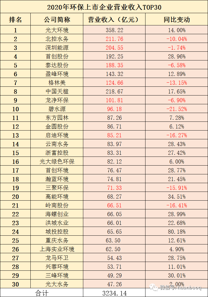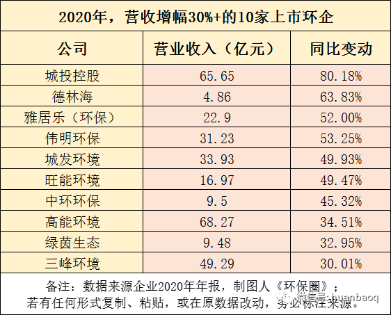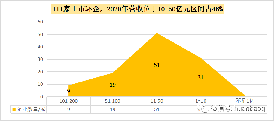 111家環(huán)保上市企業(yè),2020年?duì)I收實(shí)現(xiàn)正向增長有71家,約占64%,這一比例相較于2019年下降了16%,遠(yuǎn)低于預(yù)期,再次印證了去年疫情對(duì)我國環(huán)保產(chǎn)業(yè)沖擊。從營收分布區(qū)間來看,111家上市環(huán)企中,突破百億大關(guān)的有9家,分別是光大環(huán)境(358.22億元,14%)、北控水務(wù)(211.76億元,-10.04%)、深圳能源(204.55億元,-1.74%)、首創(chuàng)股份(192.25億元,28.96%)、泰達(dá)股份(188.35億元,-6.58%)、盈峰環(huán)境(143.32億元,12.89%)、格林美(124.66億元,-13.15%)、中國天楹(218.67億元,17.65%)、龍凈環(huán)保(101.81億元,-6.9%)。9家百億級(jí)的環(huán)保上市企業(yè)中,只有光大環(huán)境、首創(chuàng)股份、盈峰環(huán)境、中國天楹4家禁受住了疫情的壓力,2020年?duì)I業(yè)收入實(shí)現(xiàn)同比上升,其余5家較上年度都在下滑。而三聚環(huán)保、碧水源和啟迪環(huán)境,曾經(jīng)在2018年-2019年間營收突破百億,一場(chǎng)疫情過后,2020年又從百億營收陣營中“出局”了。111家上市環(huán)企,2020年?duì)I收在51億元-100億元區(qū)間有19家,龍馬環(huán)衛(wèi)、興蓉環(huán)境首次擠進(jìn)50億元營收陣營;而營收在10億元-50億元區(qū)間的上市環(huán)企,有51家,約占半數(shù);營收區(qū)間位于1億元-10億元的“小而美”上市環(huán)企,有31家,它們大多是科創(chuàng)板企業(yè)(如圖三所示)。圖三:111家上市環(huán)企,2020年?duì)I收分布區(qū)間圖經(jīng)過2018年的產(chǎn)業(yè)寒冬,2019年的民企易主國資混改熱潮,2020年的新冠肺炎疫情沖擊,現(xiàn)如今,我國環(huán)保產(chǎn)業(yè)間的兼并重組洗牌階段已接近尾聲。從每年?duì)I收TOP30強(qiáng)上市環(huán)企排名中,就能窺探一二(如圖四所示)。有的企業(yè)一直穩(wěn)居行業(yè)前幾,比如光大環(huán)境、北控水務(wù)、盈峰環(huán)境;有的企業(yè)一直在走上坡路,排名不停地向前,比如業(yè)績(jī)一直保持穩(wěn)健增長的首創(chuàng)股份、首創(chuàng)環(huán)境,高能環(huán)境、瀚藍(lán)環(huán)境、海螺創(chuàng)業(yè)、龍馬環(huán)衛(wèi)、興蓉環(huán)境;還有的企業(yè),在這輪“你追我趕”激烈競(jìng)爭(zhēng)中,沒跟著節(jié)奏發(fā)展趨于緩慢,比如上文提到碧水源、三聚環(huán)保、啟迪環(huán)境。有人進(jìn),有人退,任何商業(yè)游戲均是如此。被PPP折斷雙翼的上市民企退了,大型央企來了,地方國資進(jìn)駐了,我國環(huán)保產(chǎn)業(yè)競(jìng)爭(zhēng)格局早已不是從前的樣子了。圖四:2020年環(huán)保上市企業(yè)營業(yè)收入TOP30營收增速:雅居樂排名第三,偉明環(huán)保連續(xù)9連增