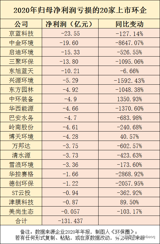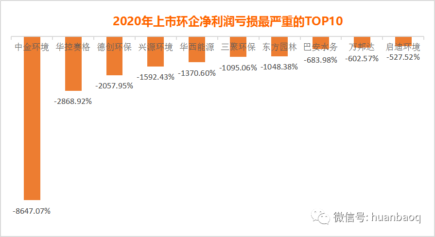 在外界宏觀條件不利、疫情生死攸關(guān)的2020年,仍有一些出類拔萃的上市環(huán)企脫穎出來,從凈利潤增速來看,2020年增速較快TOP10上市環(huán)企非常有看點(diǎn)(如圖八所示)。既有以買賣股權(quán)實(shí)現(xiàn)業(yè)績(jī)騰飛的聚光科技,也有前幾年負(fù)面纏身,疫情之下實(shí)現(xiàn)翻盤的中創(chuàng)環(huán)保和淪為*ST科林,還有被PPP拖累,引國資混改的蒙草生態(tài)和節(jié)能鐵漢,以及受疫情影響較小一線固廢名企,如僑銀環(huán)保、玉禾田、浙能錦江環(huán)境、玉禾田、深圳能源等。圖八:2020年環(huán)保上市企業(yè)凈利潤增速較快TOP10首先,凈利潤增幅最大當(dāng)屬聚光科技。2020年歸母凈利潤實(shí)現(xiàn)4.89億元,同比增長了1128.82%,主要原因是公司將持有的上海安譜實(shí)驗(yàn)公司25.18%股權(quán),擬以3.6億元價(jià)格轉(zhuǎn)讓給廣州德福、杭州青丘。其次是被PPP拖累,遭遇生死劫的蒙草生態(tài)。據(jù)悉,蒙草生態(tài)業(yè)績(jī)實(shí)現(xiàn)大幅增長得益于旗下秦草、藏草、新草等子公司的運(yùn)營良好,鞏固其核心競(jìng)爭(zhēng)力。其中,秦草經(jīng)過激烈競(jìng)標(biāo),在眾多國內(nèi)外知名企業(yè)中勝出,拿下22億元EPC總承包合同,還有子公司快樂小草的足球場(chǎng)建設(shè)、走路草坪等業(yè)務(wù)業(yè)發(fā)展迅猛。還有,連虧2年,終于在2020成功扭虧為盈的中創(chuàng)環(huán)保(原三維絲)也值得一提。有分析人士認(rèn)為,隨著原股東“淡出”,上海中創(chuàng)控股后,雖然從經(jīng)營數(shù)據(jù)上看,已有好轉(zhuǎn)趨勢(shì),但要消除持續(xù)多年的負(fù)面影響還需觀察。最后是受疫情影響較小,又趕上垃圾分類、市政環(huán)衛(wèi)好時(shí)候的僑銀環(huán)保。2020年?duì)I收同比增長28.87%,凈利潤大增186.03%,主要是去年疫情免收增值稅、環(huán)衛(wèi)運(yùn)營項(xiàng)目充沛等影響。接下來,這些企業(yè)2020年經(jīng)營狀況不免有點(diǎn)慘淡了,真可謂旱的旱死,澇的澇死。在111家上市環(huán)企中,2020年歸母凈利潤同比下滑的有26家,虧損有20家(如圖九所示),累計(jì)虧損金額高達(dá)132億元,京藍(lán)科技、中金環(huán)境、啟迪環(huán)境、三聚環(huán)保、東旭藍(lán)天都虧損了10億元以上。可喜的是,博天環(huán)境雖然繼續(xù)虧損,但虧損幅度收窄,相較于上年同期增長了40.57%。圖九:2020年歸母凈利潤實(shí)現(xiàn)虧損的20家上市環(huán)企如果要在這20家虧損企業(yè)中,找到2020上市環(huán)企虧損幅度最大的“十大虧損王”,如圖十所示中金環(huán)境、德創(chuàng)環(huán)保、華控賽格、興源環(huán)境、三聚環(huán)保、東方園林、巴安水務(wù)、萬邦達(dá)、啟迪環(huán)境、清水源都“榜上有名”。圖十:2020上市環(huán)企虧損幅度最大的“十大虧損王”中金環(huán)境成為當(dāng)之無愧的“虧損王”,2020年凈虧損高達(dá)19.6億元,相較于2019年的2292萬元,下降了8647.07%,驚呆業(yè)界。據(jù)筆者觀察,其實(shí)從2018年中金環(huán)境就已經(jīng)開始走下坡路了。2018年,凈利潤4.3億元,比上年下滑27.17%,2019業(yè)績(jī)繼續(xù)下滑,凈利潤僅為2292萬,到了2020年,經(jīng)營更加惡化,虧損了19.6億元。巨虧原因主要受新冠肺炎疫情及市場(chǎng)環(huán)境影響,子公司金泰萊、中咨華宇無法完成業(yè)績(jī)承諾,面臨巨額資產(chǎn)減值問題,預(yù)計(jì)計(jì)提商譽(yù)減值金額共計(jì)17.50億元至19億元之間。同樣經(jīng)營惡化,由盈轉(zhuǎn)虧還有華控賽格、德創(chuàng)環(huán)保,這兩家企業(yè)2019年同期凈利潤分別為594萬元、625萬,到了2020年,受疫情及全球經(jīng)濟(jì)衰退的影響,環(huán)保工程業(yè)務(wù)出現(xiàn)下滑,凈利潤分別虧損約1.66億元、1.22億元,同比下降2868.92%、2057.95%。縱觀這些虧損上市環(huán)企,雖然每家企業(yè)跌倒原因不同,但年報(bào)都不約而同提及幾個(gè)方面:國內(nèi)外新冠疫情導(dǎo)致復(fù)工復(fù)產(chǎn)、項(xiàng)目結(jié)算周期延遲和政府支付能力下滑;環(huán)保市場(chǎng)競(jìng)爭(zhēng)加劇,導(dǎo)致項(xiàng)目毛利減少;部分環(huán)保細(xì)分領(lǐng)域,僧多肉少,市場(chǎng)趨于飽和。老舊項(xiàng)目回款不暢,應(yīng)收賬款居高不下,導(dǎo)致壞賬減值計(jì)提損失。如東江環(huán)保年報(bào)提到,營收下滑主要系疫情影響,工業(yè)企業(yè)開工減少,導(dǎo)致危廢處理量下降;且隨著新增產(chǎn)能陸續(xù)投產(chǎn),行業(yè)競(jìng)爭(zhēng)日趨激烈,市場(chǎng)收運(yùn)和處理費(fèi)價(jià)格有所下滑。再如中環(huán)裝備年報(bào)提到,面對(duì)傳統(tǒng)煙氣治理市場(chǎng)飽和,獲取大氣減排訂單變得越來越難,對(duì)公司業(yè)績(jī)?cè)斐刹恍〉挠绊憽?/span>無論如何,凡此過往皆為序章,最難的2020年都已過去了,面向“十四五”,所有企業(yè)都將面臨新的機(jī)遇和挑戰(zhàn)。業(yè)績(jī)好的2021年再接再厲,續(xù)寫輝煌;業(yè)績(jī)差的則要再接再厲,打個(gè)漂亮的翻身仗。未來,《環(huán)保圈》將持續(xù)關(guān)注業(yè)內(nèi)企業(yè)動(dòng)態(tài),觀察行業(yè)大勢(shì),為讀者奉獻(xiàn)更多精彩的分析。